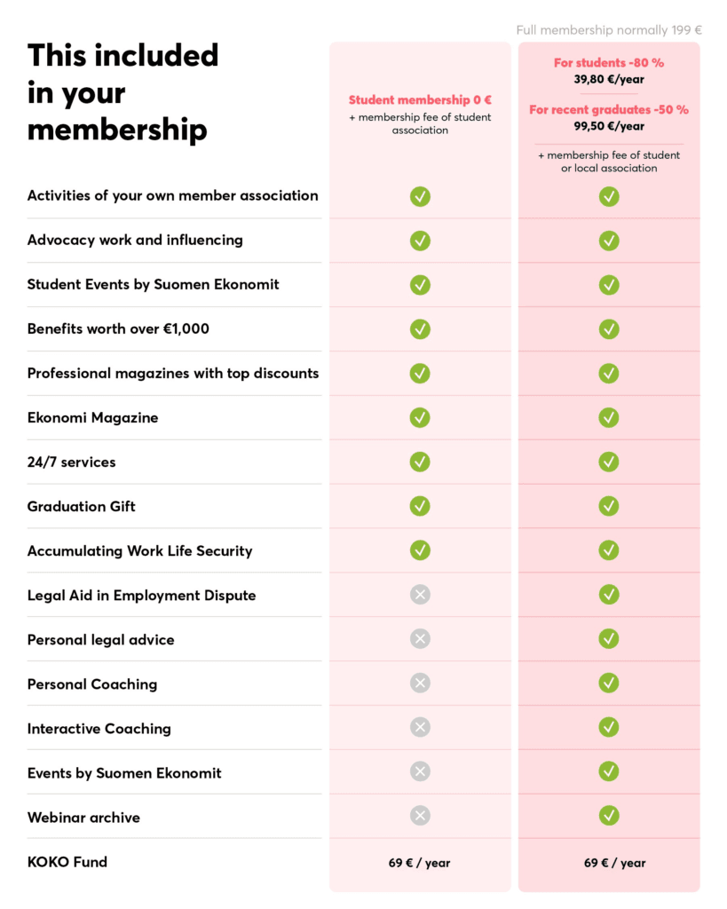 It is possible for students to purchase the student’s full membership subject to a separate fee, in which case the student will have access to the broader services and membership benefits of Suomen Ekonomit. The student’s full membership also includes the services and benefits included in the free student membership.