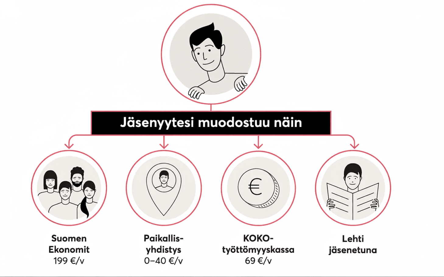 Mitä maksat? 199 €/vuosi – tämä tarkoittaa vajaa 17 €/kk. Hinta on yksi liittojen alhaisimmista. Tästä osuudesta lasketaan myös mahdollinen jäsenmaksualennus. Uusi jäsen saa -50 % Suomen Ekonomien osuudesta ensimmäisen kahden vuoden ajan. Opiskelijalle Suomen Ekonomien jäsenyys sisältyy opiskelijayhdistyksen jäsenmaksuun.