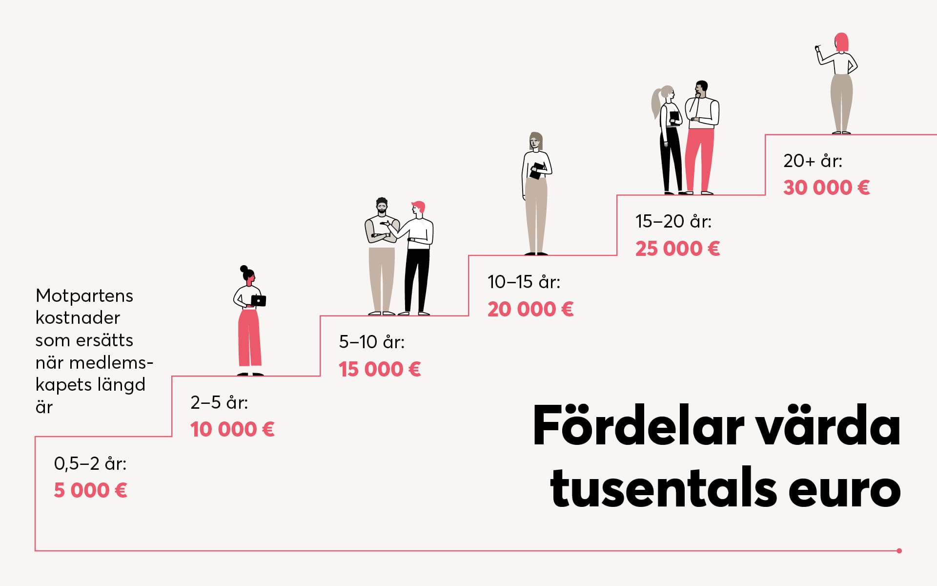 En jurists arbete i en rättstvist kan kosta upp till 50 000 €. Som medlem betalar du ingenting. Vi ersätter även motpartens kostnader utifrån hur länge du har varit medlem.